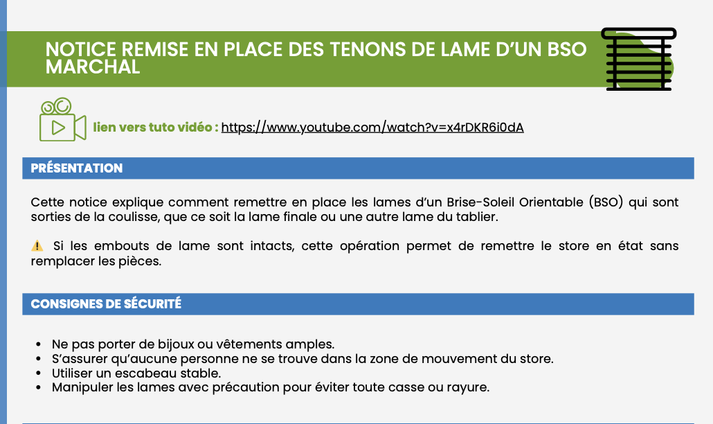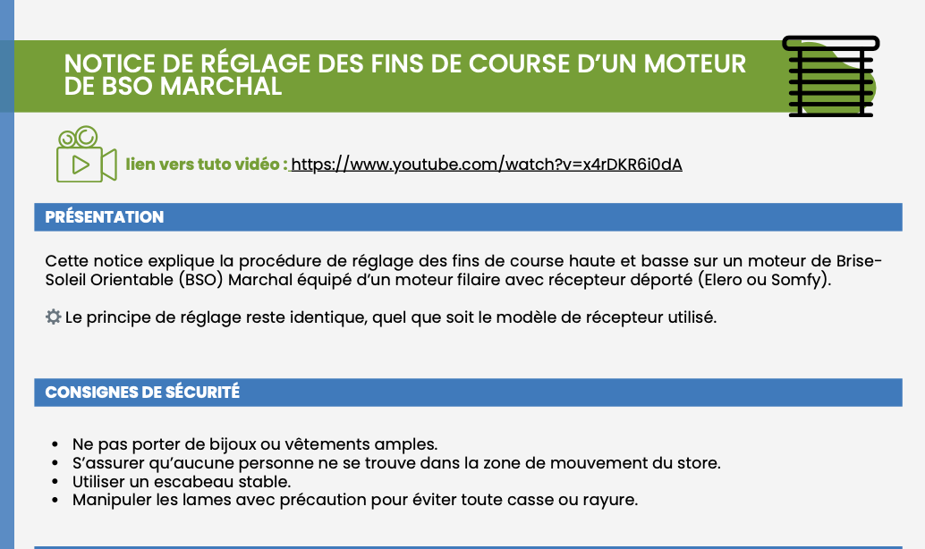Retrouvez ici tous les tutoriels vidéo et notices écrites pour vous aider à installer, régler et entretenir vos produits Marchal : BSO, volets, pergolas, stores et portails.