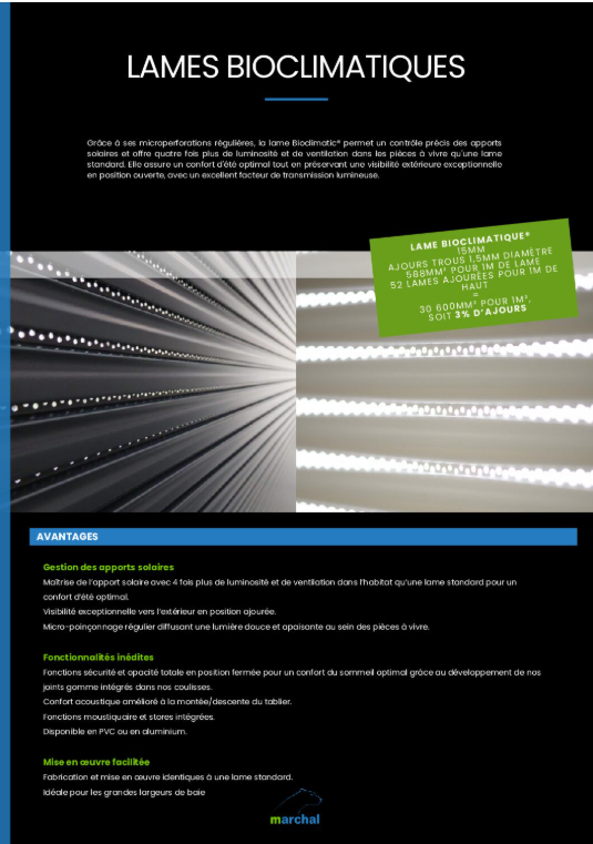 Grâce à ses microperforations régulières, la lame Bioclimatic® permet un contrôle précis des apports solaires et offre quatre fois plus de luminosité et de ventilation dans les pièces à vivre qu’une lame standard. Elle assure un confort d’été optimal tout en préservant une visibilité extérieure exceptionnelle en position ouverte, avec un excellent facteur de transmission lumineuse.